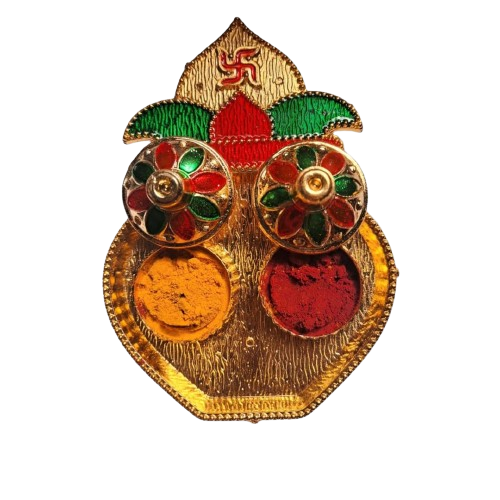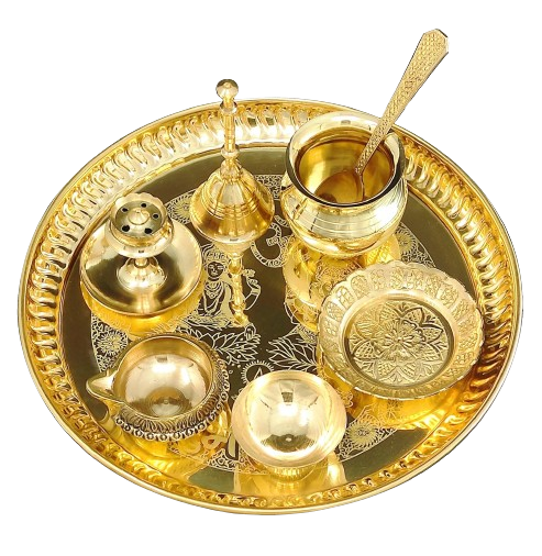 a beautifully crafted puja thali designed to honor Ganpati Bappa. Made with a radiant golden finish, this thali includes all the essential items needed for a traditional Ganpati puja. Its elegant design and divine aura make it a perfect addition to your festive rituals, enhancing the spiritual ambiance and bringing blessings to your home.