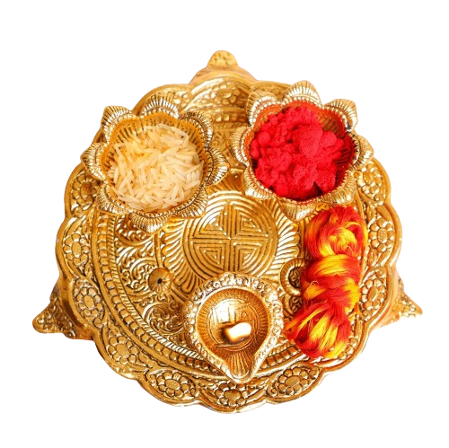 Presenting the Golden Blessings Thali, an exquisite puja thali designed specifically for your Ganpati Bappa rituals. This stunning golden thali is adorned with intricate detailing, making it a perfect blend of tradition and elegance. It includes all the necessary items for a complete and heartfelt puja, ensuring that your offerings are presented with the utmost devotion and grace. Elevate your celebrations with this beautiful and auspicious thali, crafted to bring divine blessings into your home.